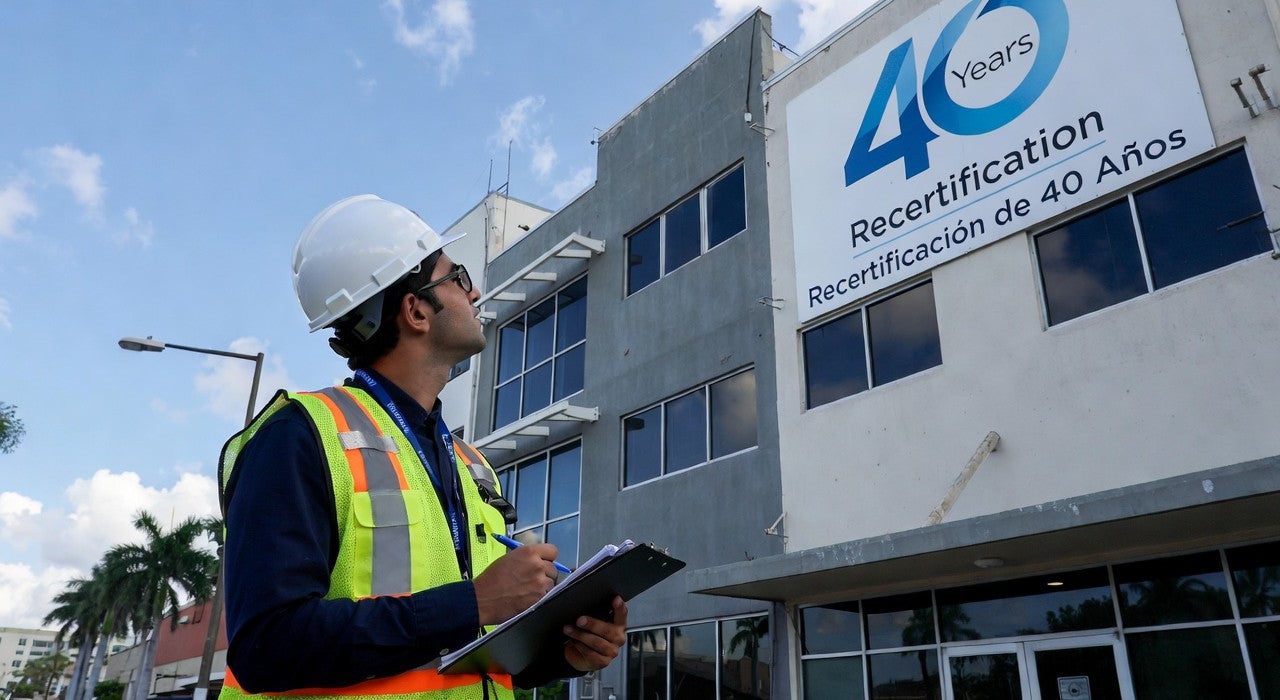 Recertificaciones obligatorias (milestone inspections, 40-year recertifications) para condominios y edificios multifamiliares/comerciales post-Surfside. Incluyen inspecciones visuales/no destructivas, evaluaciones eléctricas/estructurales y planes de reparación detallados bajo FBC 2023.